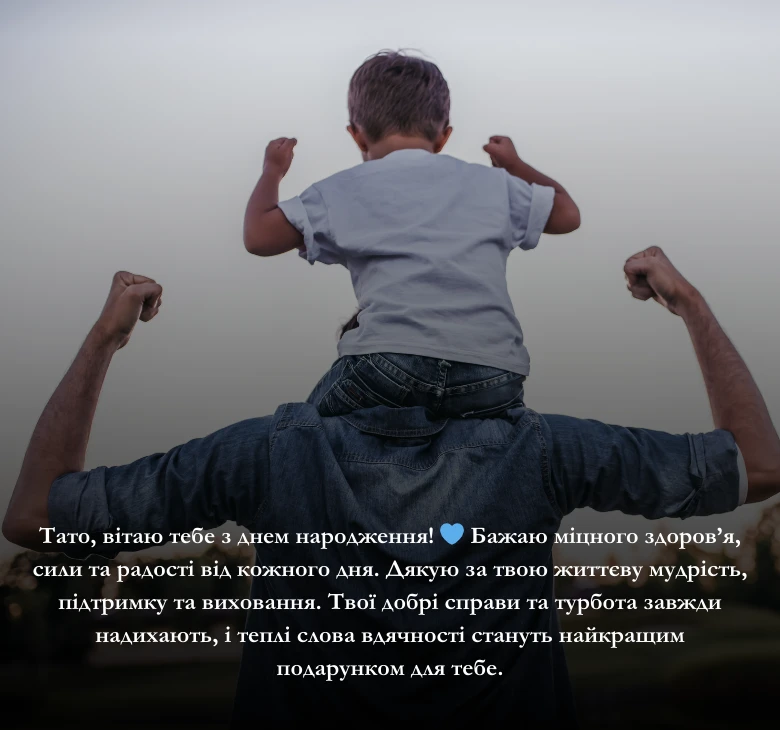 Тато, вітаю тебе з днем народження! 💙 Бажаю міцного здоров’я, сили та радості від кожного дня. Дякую за твою життєву мудрість, підтримку та виховання. Твої добрі справи та турбота завжди надихають, і теплі слова вдячності стануть найкращим подарунком для тебе.