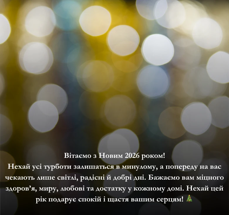 Новорічні свята – це час, коли ми ділимося теплом, добрими словами та щирими побажаннями. Нехай 2026 рік принесе мир, любов, злагоду та добробут у кожну домівку, а віра у світле майбутнє та перемогу нехай живе в серці кожного українця.