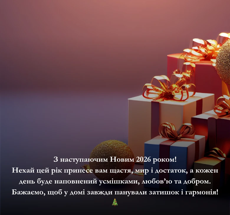 З наступаючим Новим 2026 роком! Нехай цей рік принесе вам щастя, мир і достаток, а кожен день буде наповнений усмішками, любов’ю та добром. Бажаємо, щоб у домі завжди панували затишок і гармонія! 🎄